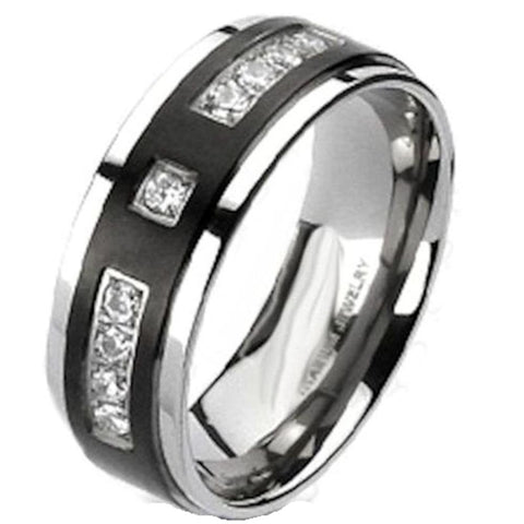 His Hers Black and Clear Cz Wedding Ring Set Sterling Silver and Titanium. Edwin Earls offers this exquisite wedding engagement ring set. The center stone is a square black CZ princess cut 6 mm (1 ct) stone. Princess cut stone is surrounded by round clear pave stones with pave' stones set on the shaft of the ring on both sides. The matching wedding band is included. The CZ stones are AAA quality. The ring is solid .925 sterling silver with a rhodium finish that is the same finish that is used for fine white gold and platinum jewelry. Our man's ring is a Titanium wedding band. The man's ring has black plating. The band is 7mm wide. Titanium is extremely durable and strong and will endure the wear of the active guy.
